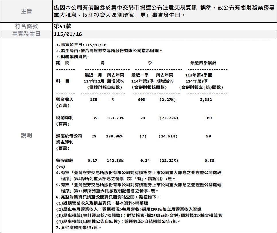系因本公司有价证券于集中交易市场达公布注意交易信息标准,故公布有关财务业务等重大讯息,以利投资人区别了解 _更正事实发生日。