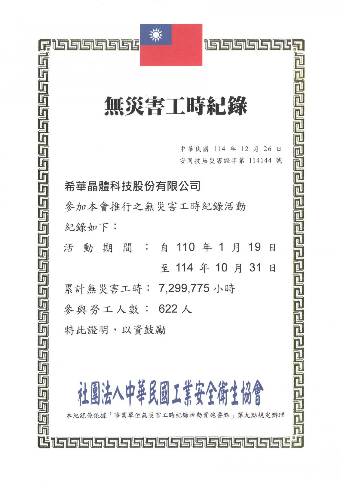 希華晶體榮獲社團法人中華民國工業安全衛生協會頒發「無災害工時紀錄」證明書。