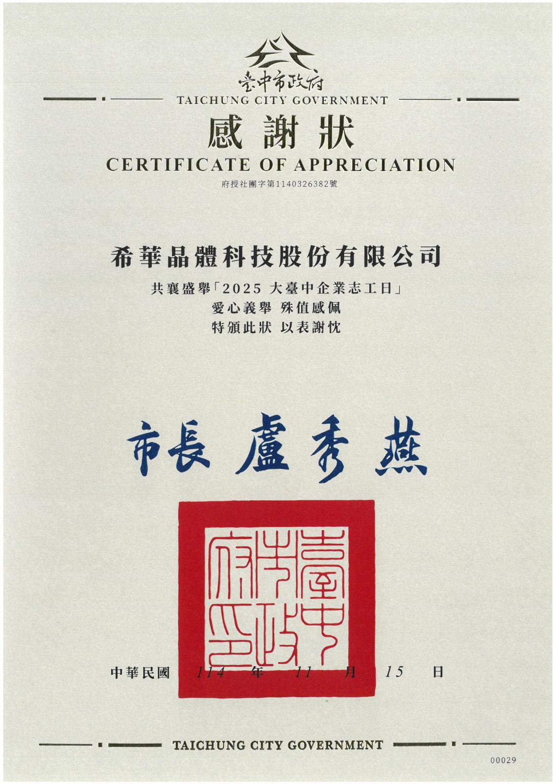 希華晶體科技秉持永續經營理念,積極推動企業志工服務。公司今年參與「大台中企業志工日」活動,投入社區支持與關懷服務項目,並獲台中市政府頒發感謝狀,肯定希華晶體在企業公民責任上的持續努力。