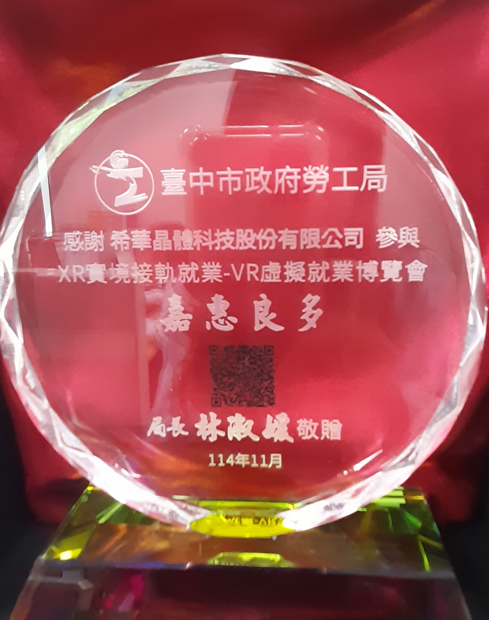 一向走在科技與人才培育前端的希華晶體科技,獲得臺中市政府勞工局高度肯定,頒發感謝獎牌,表彰希華在「XR實境接軌就業-VR虛擬就業博覽會」中的貢獻,特別是配合拍攝深度企業介紹影片,以先進的沉浸式科技,為求職者打造前所未有的虛擬求職體驗。